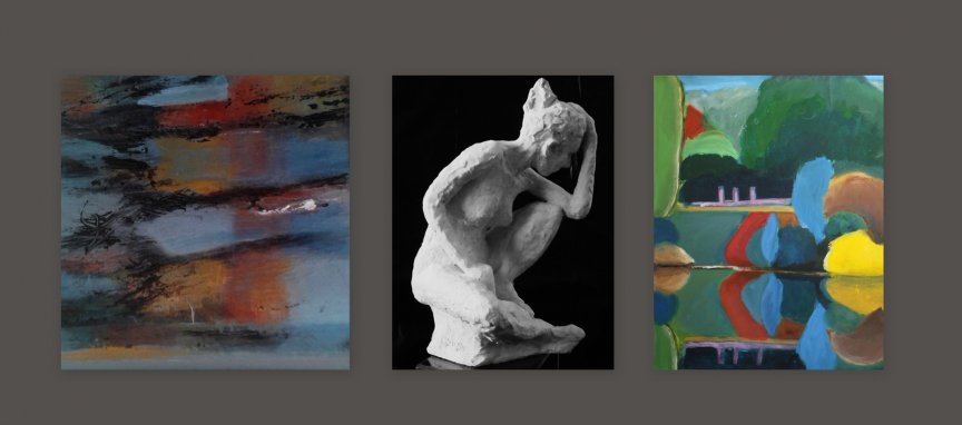 Antoinette, Christiane et Chantal exposent ensemble à l'Utopicerie : elles se sont rencontrées dans une même passion, la peinture. Christiane a développé ensuite sa pratique artistique par la sulpture.
